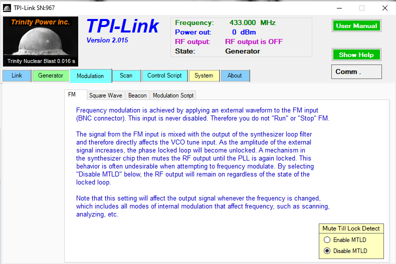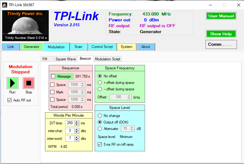 Supports FM, OOK, Morse Code, and Beacon signal generation. Easily test radio systems or simulate transmission behavior.
